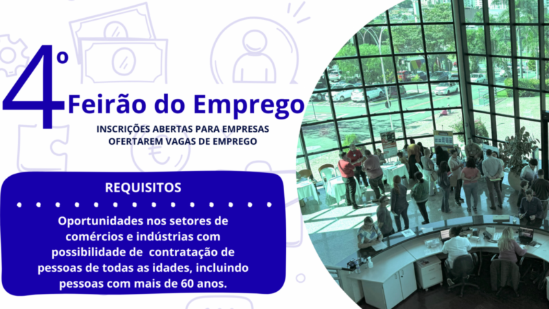 O evento acontecerá no Paço Municipal, das 8h às 13h, e contará com a participação de 33 empresas, que estarão ofertando 523 vagas de emprego disponíveis no dia.