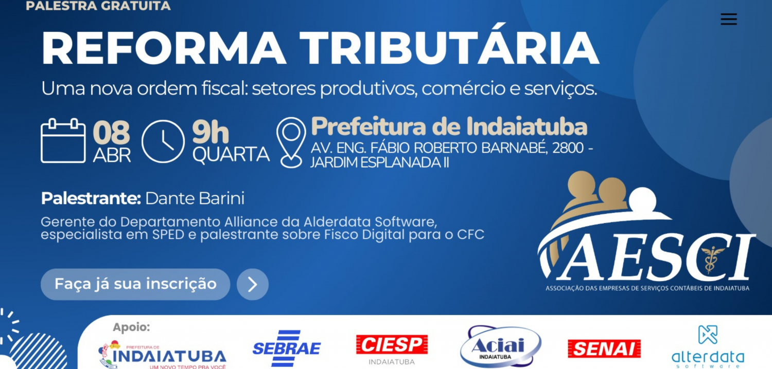 No dia 8 de abril, a Associação das Empresas de Serviços Contábeis de Indaiatuba (Aesci) promove a palestra “Reforma Tributária – Uma nova ordem fiscal: setores produtivos, comércio e serviços”, ministrada pelo especialista em sistemas de informação voltados à área fiscal e ao Sistema Público de Escrituração Digital (SPED), Dante Barini Filho. Interessados devem se inscrever pelo link: https://www.sympla.com.br/evento/reforma-tributAria—uma-nova-ordem-fiscal-setores-produtivos-comercio-e-servicos/3343490.
