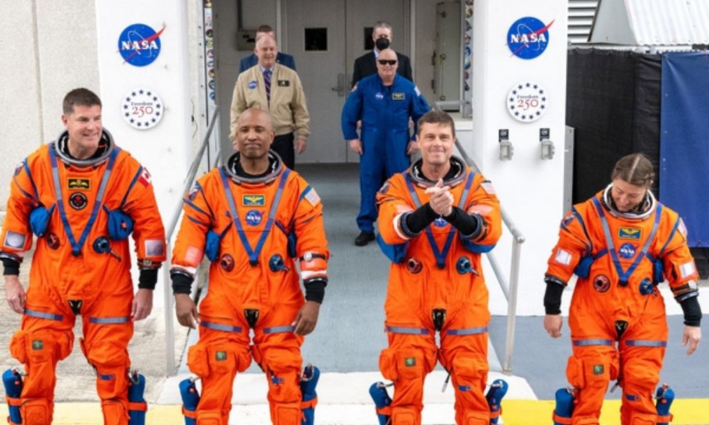 Especialista de missão Jeremy Hansen, da CSA (Agência Espacial Canadense), o piloto Victor Glover, o comandante Reid Wiseman e a especialista de missão Christina Koch saem do Edifício de Operações e Verificação Neil A. Armstrong antes do lançamento da Artemis II no Centro Espacial Kennedy da NASA